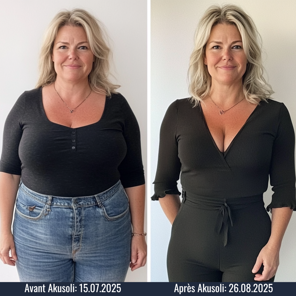 « Ma sœur, qui est orthopédiste, m’a toujours dit à quel point les pieds et le métabolisme sont liés. Si je l’avais écoutée plus tôt, je me serais épargné bien des efforts ! Aujourd’hui, Akusoli est devenu un élément indispensable de mon parcours minceur – et les résultats parlent d’eux-mêmes : 8,5 kilos en moins ! »
